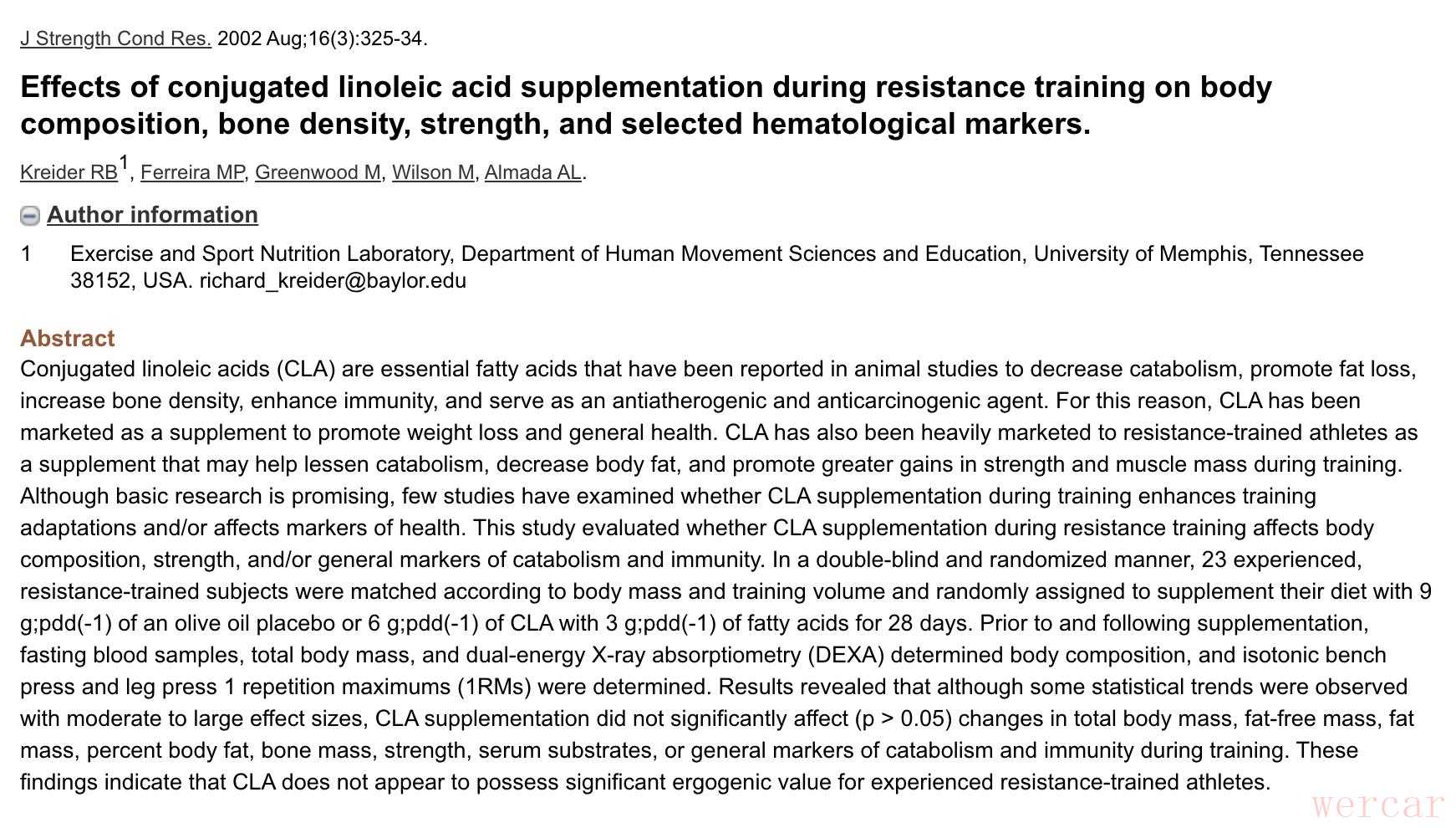 2002年的另一项研究也发现:对于有一定经验的健身人群来说,CLA却没有任何效果!这个研究也让很多健身的人大跌眼镜,以及包括很多生产CLA的厂家都不能接受。