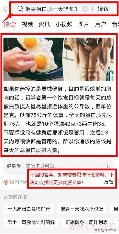例如:你想知道健身的人一天需要多少蛋白质,直接在搜索框输入问题:“健身蛋白质一天吃多少”
