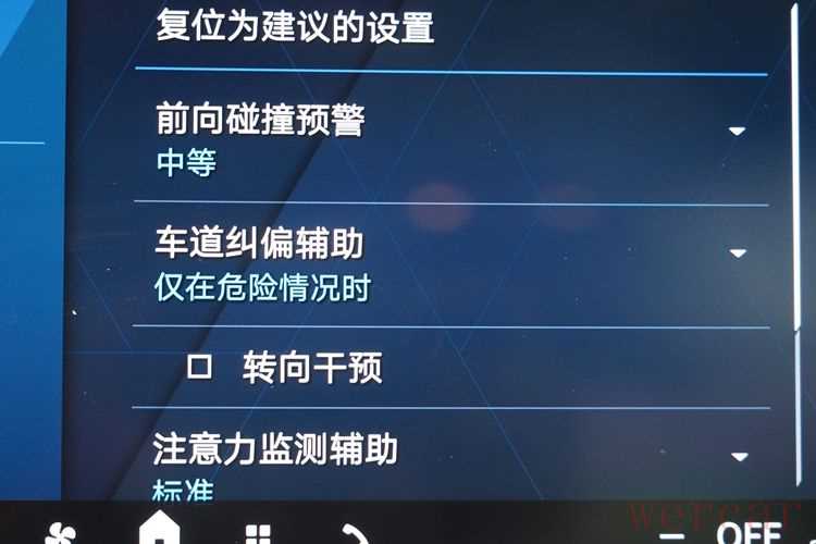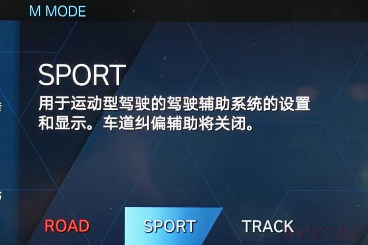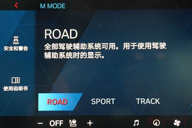 在中控屏的二级页面里,还有个驾驶模式的选项,有3个内容——公路(ROAD)、运动(SPORT)、赛道(TRACK)。其中,公路模式是常规驾驶,各种驾驶辅助功能都在发挥作用。