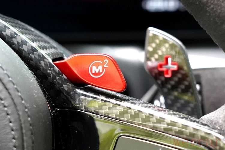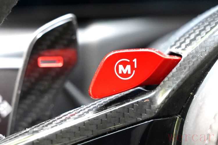 该车更为新颖的设计,是在换挡拨片的前面,有个红色的“M”拨片,这是M4驾驶控制当中的一项,拨片左右各一,其中,左手处是M1。