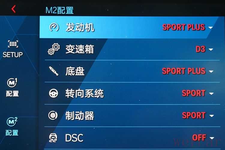 右手处的按键是M2,启动它之后,发动机效率进一步提升,底盘的减振器阻尼再上一个台阶,也就是俗话说的变的更硬了。这时候,您会感觉车辆异常“直接”,相当暴躁,仿佛疯狂的公牛,谁也挡不住。