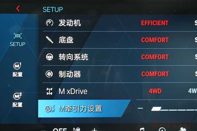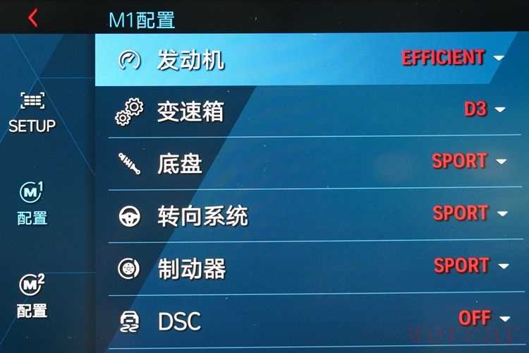 下图是启动M1之后,液晶屏显示的内容——发动机效率提升,底盘、转向、制动、四驱均进入运动模式,车身稳定控制系统关闭,驾驶者可以随心所欲地控制车辆,系统停止干预。