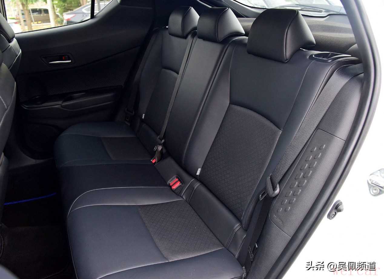 说完了变化的地方,再说说大家关心的其他一些问题。第一个是乘坐的空间感,注意不是空间。其实C-HR后排的乘坐空间并没有想象中这么差,腿部会比缤智和探歌差一点,和三菱的奕歌差不多。C-HR的问题在于后排的视野太差,由于造型关系,后窗设计得很小,你正常乘坐,你的侧面是完全被C柱挡得严严实实,就是标准的铁窗泪。另外,双擎C-HR的后排依然没有中央扶手和空调出风口,对后排乘客还是不够友好。