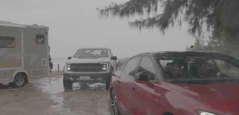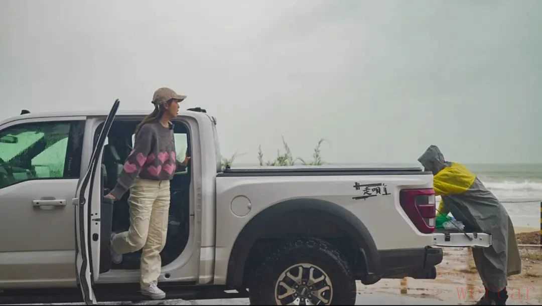 另外极端天气下得说一下这台车的实用性,既然拿它作为工具车,那么几乎所有湿的、脏的全部放在猛禽的后斗,这台车标配了耐磨涂层,所以完全不用担心海水的腐蚀,相当于这台车自动就给了你一个干湿分区,但即使这次我们穿着雨衣坐进车内,皮座椅在有了水汽之后,打开座椅加热,瞬间就干爽了。