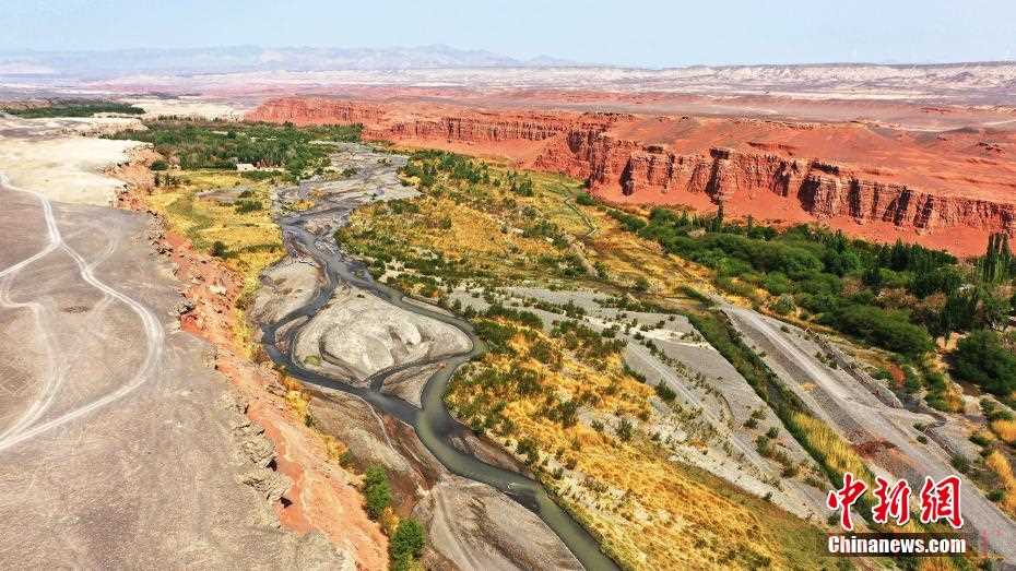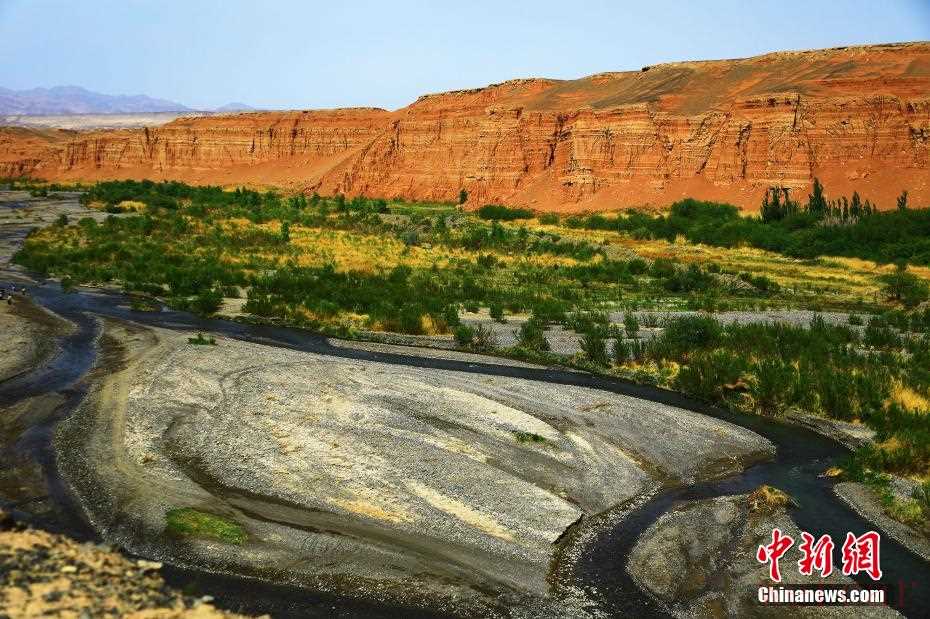 两岸山体呈现出红色,蜿蜒十几公里,从河谷崖壁飘向天山脚下,汇成一条红色的“飘带”。 韩栋 摄