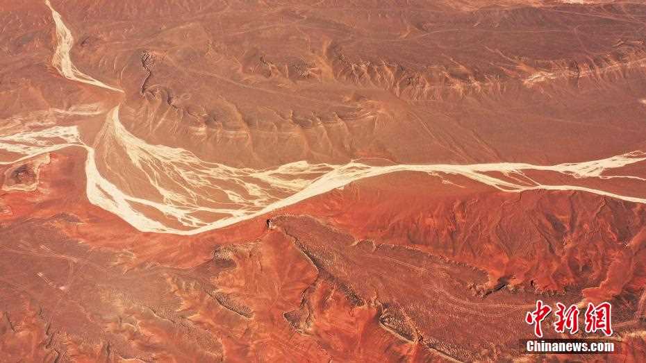 从河谷崖壁飘向天山脚下,汇成一条红色的“飘带”。 韩栋 摄