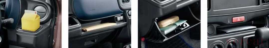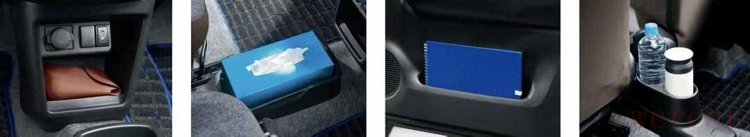 车身尺寸虽然小,但储物空间不少,中控台两侧出风口下面有水杯架,副驾驶下方有储物槽,中控台下方有储物盒,车门底部有储物槽,后排有水杯架。