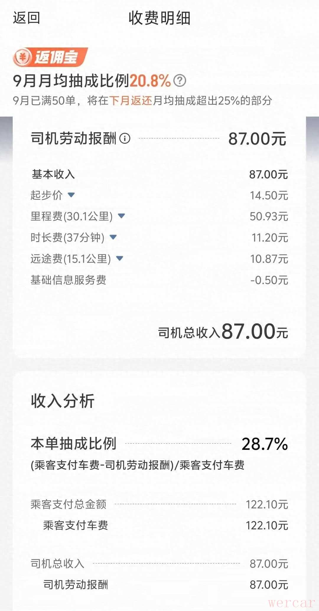 一位滴滴司机展示他的订单抽成比例数据。图/滴滴司机端后台截图
