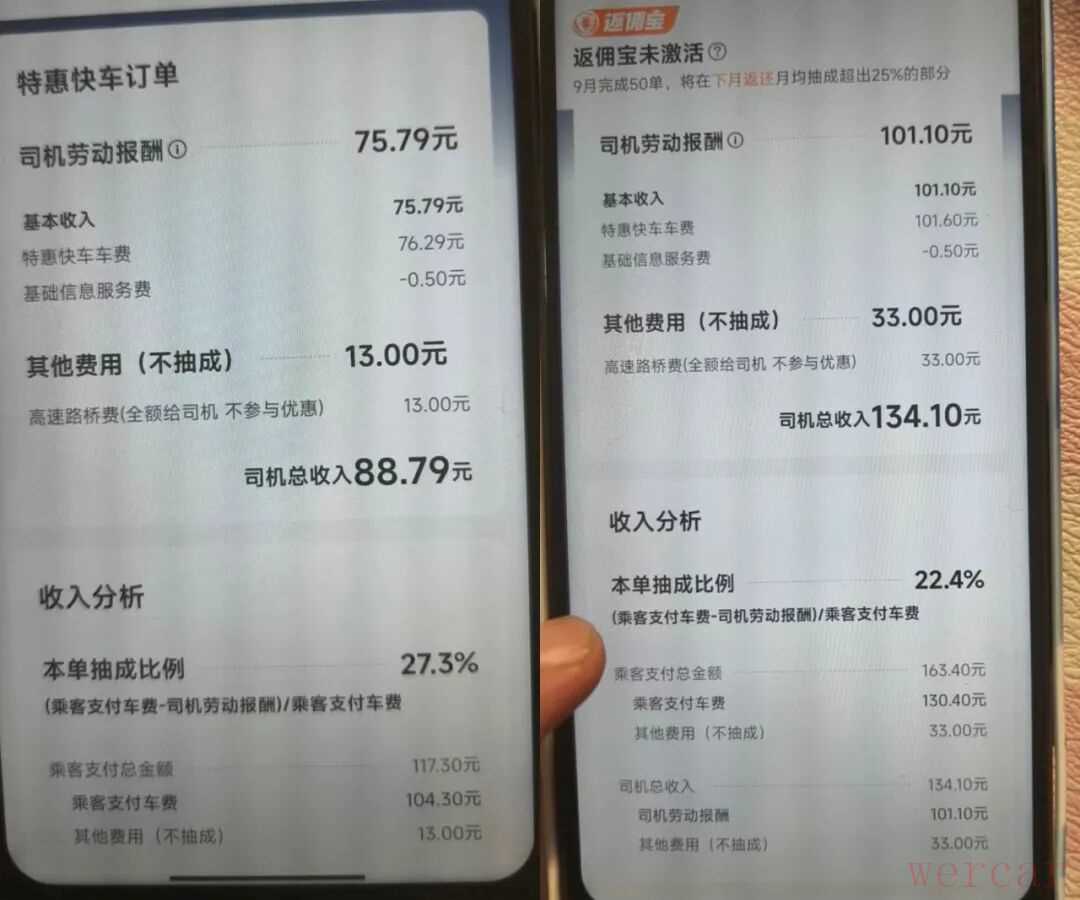 “近期(抽成比例)无明显变化。”有六年驾龄的网约车司机李先生称,他的抽成比例在14%–29%之间,与车费高低无关,而与行程速度、优惠券等因素相关。从他的后台数据可见,最近3笔特惠订单抽成比例分别为22.4%、14.9%、27.3%。其中抽成27.3%的一单,乘客实付104.30元,司机获得75.79元。