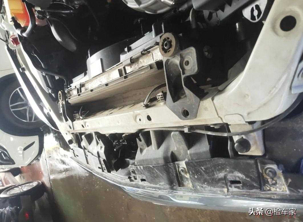 机舱部分,我把饰板拆下来观察之后,发现车子的水箱框架没有变形和钣金切割的痕迹,证明前部保险杠的做漆和中网的更换的,是小碰撞导致,撞击力度不大。