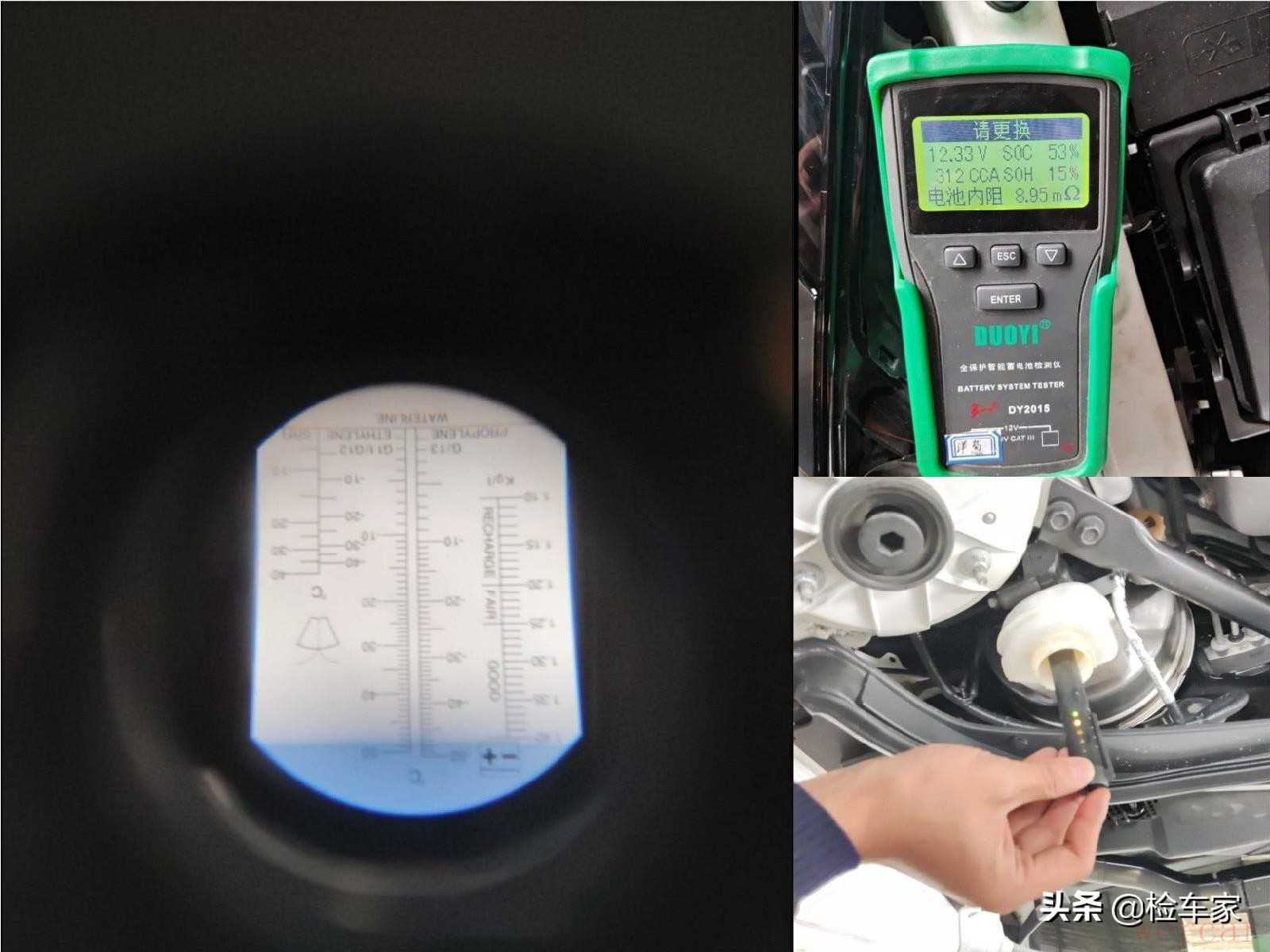 接下来,检查车子的油水,从照片可以看出防冻液和刹车油都没有什么问题,但是电瓶通过仪器观察,需要更换了,电瓶的正常寿命一般在三年左右,保养好一点的能达到四年或者五年。所以这辆3年的ATSL也该更换电瓶了,而且车行的车,除了特别热门的车,一般停放时间都比较长,亏电都比较厉害。