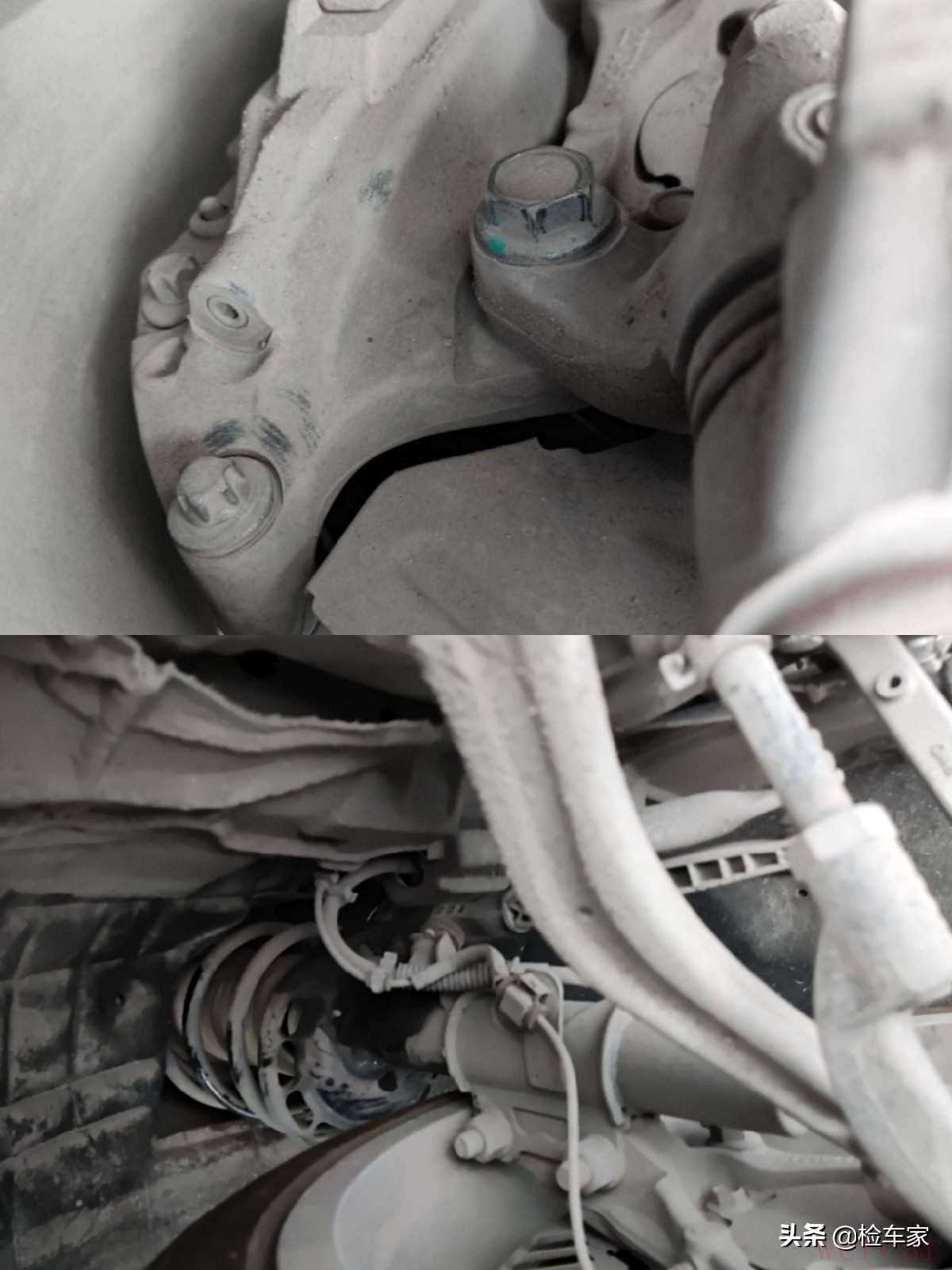 为了验证我的猜想,接着我检查了刹车分泵和减震,发现左前刹车分泵的螺丝有明显的拆卸痕迹。一般拆卸的情况有两种:改装拆卸或者换刹车片和刹车盘导致的拆卸。如果是改装拆卸,四个刹车分泵的螺丝都应该有拆卸的痕迹,但是目前只有左前刹车分泵的大螺丝有拆卸痕迹,应该是换了刹车盘引起的拆卸。右前减震还有明显渗漏,3万公里的车子是不会有这些情况的。