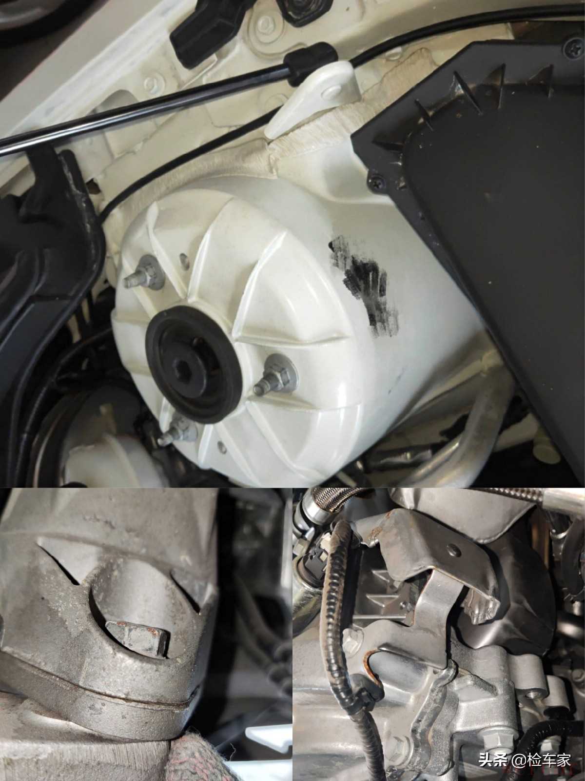 经检测,发现气门室盖垫没有渗漏;发动机也没有拆卸分解的痕迹;但是发动机机脚有拆卸更换;减震器座固定减震的螺丝也有拆卸。这个时候我就有点纳闷了,为什么3万多公里的车,发动机机脚会拆卸更换呢?你说减震螺丝拆卸我能理解,毕竟通用的车减震漏油都是通病了,但是发动机机脚拆卸更换就有点不对劲了,等会看底盘的时候再确认一下原因吧,总有种不好的预感。