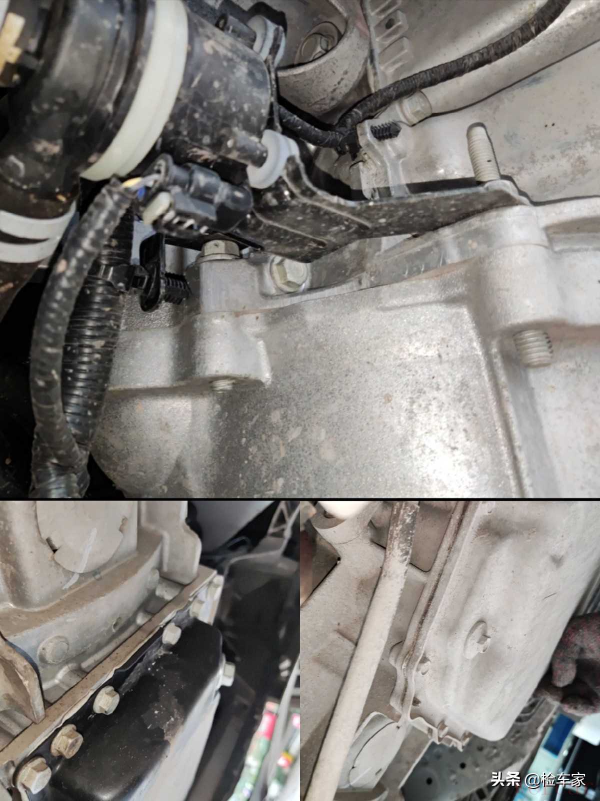 接下来检查到发动机和变速箱连接处螺丝没有拆卸也没有渗漏痕迹,油底壳也没有拆卸和渗漏的痕迹。