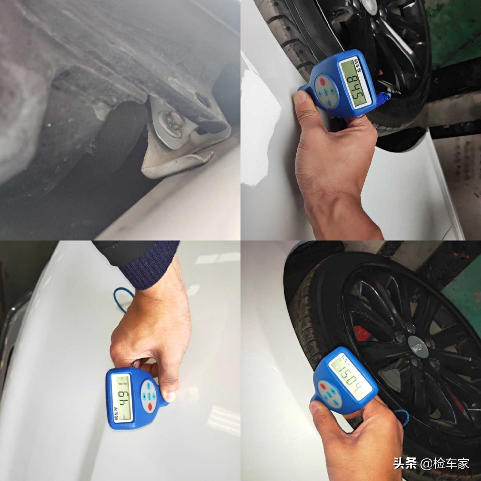 随后检测到左前翼子板拆卸腻子修复;机盖、左前门、右后翼子板、右后门有钣金腻子修复;右前翼子板有拆卸更换(拆卸更换以后,用设备打出来的数值基本上都会低于整车的平均数值),更换原因最多的一般就两种情况:要么是事故更换,要么就是改装更换,但是这个车外观没有改装痕迹,所以这个应该是事故更换。不过右前翼子板属于车辆覆盖件,如果没有伤到其它地方,问题都不大,所以等会得看一看有没有伤到翼子板骨架。外观整体来说,有几个面存在钣金喷漆,对于一辆3年的车子来说,只能算凑合。