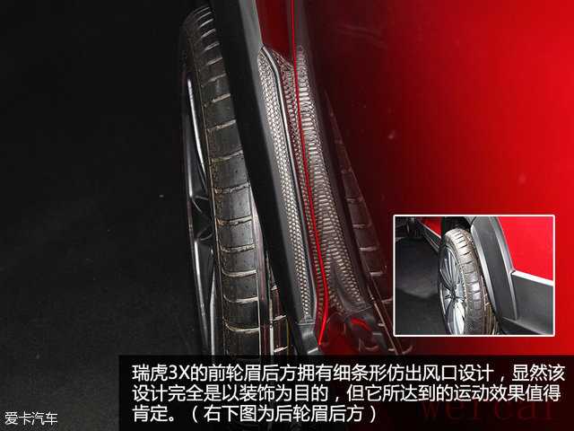 看罢瑞虎3X的前脸,我们将视线移至车侧以及车尾,瑞虎3X的车侧以及车尾设计并未草草了事。车侧比例协调,笔直的腰线与下方裙线微微上扬,呈现出些许运动感,外凸的黑色轮眉以及轮拱则能给人带来紧致且有力量的感觉。车尾给人感觉饱满且有层次感,整体造型比较和谐。