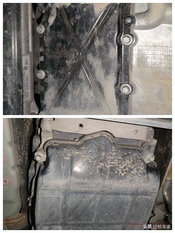 发动机油底壳没有什么问题,无拆卸无渗漏;看维保记录换过变速箱油,奔驰的车只要在4S店更换变速箱油,都是要拆卸变速箱油底壳的,需要更换一个垫子,所以目前看下来变速箱油底壳存在拆卸,问题不大。