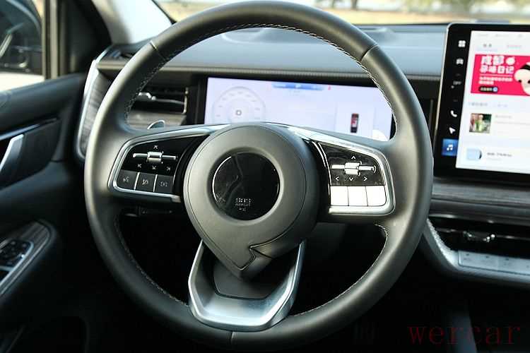 皮质方向盘不仅配有换挡拨片,还具备加热功能。如果日后在年度改款或中期改款中,将方向盘略微加粗,三、九点位置的型面贴合再改进一些,或者增加打孔皮,就更完美了。
