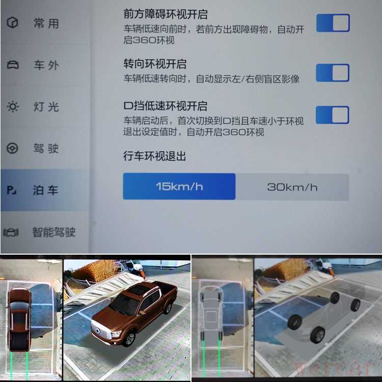 在“车控车设”界面里的“泊车”,一方面具备360度全景影像、180度透明底盘,另一方面,具备自动泊车、手机遥控泊车,以及50米之内的循迹倒车。