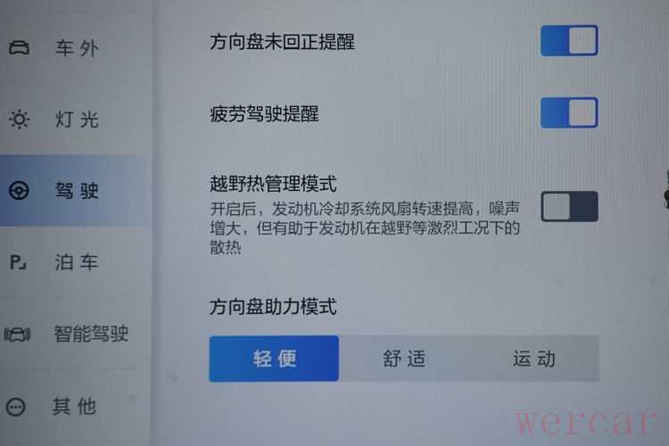 驾驶辅助方面,除了刚才提到的全景影像与自动泊车,还具备自适应巡航;安全方面的内容,主要是前后行车记录、标配6气囊、主动式双预紧+限力安全带、碰撞自动解锁、碰撞自动断油,等等。在可选项目里,我认为转向助力做得很好,轻便、舒适和运动3种模式,差异十分显著,很好地满足了不同的习惯与需求。