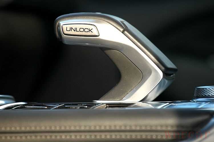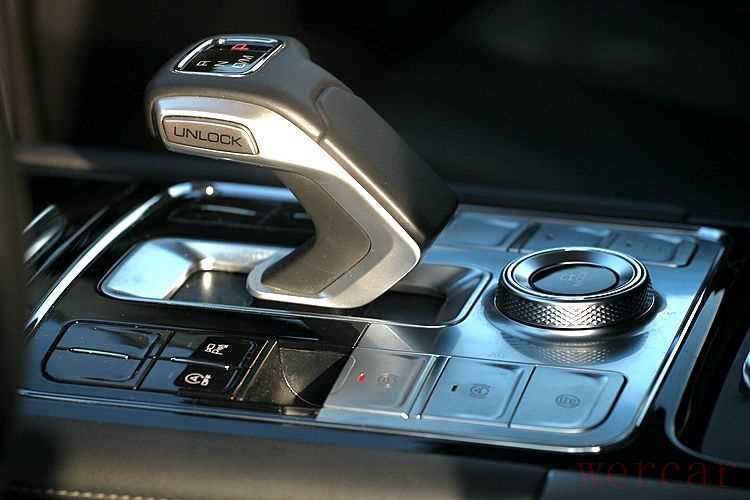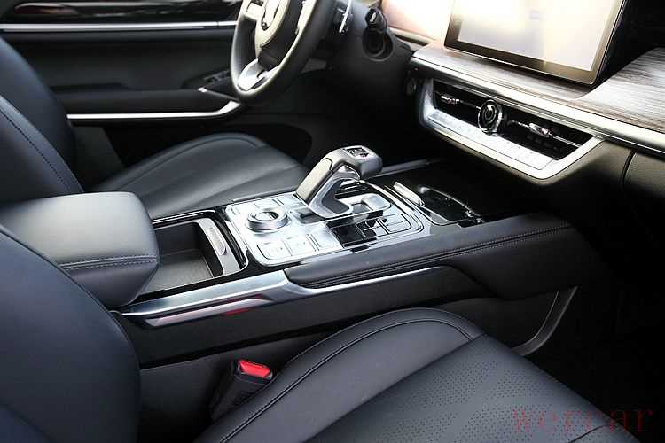中段是操作区,挡把造型挺醒目,握感也很棒。它的后面是驾驶模式选择旋钮,左右两侧是驻车制动、发动机启停、自动泊车、四驱、差速器锁等控制键。