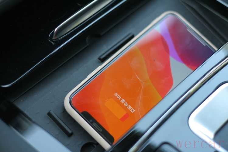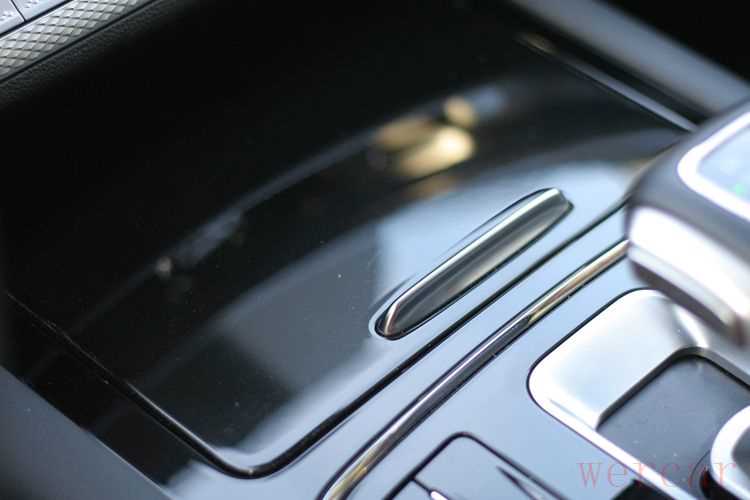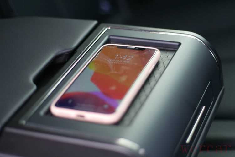 中间平台分为3个部分,前段是一扇亮面的“推拉门”,里面是手机无线充电的位置。