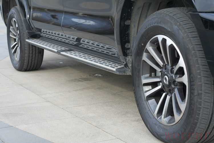 车轮是18英寸,配备265/60R18轮胎,拍摄车的装车胎是佳通的HT71。前后车轮之间的脚踏板,为上下车提供了便利。