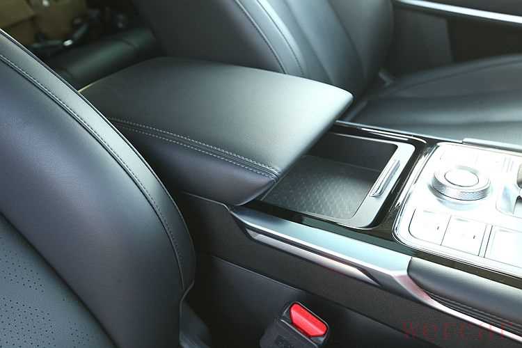 中间平台很宽,与车型定位十分吻合。平台两侧包裹着皮革,下部是镂空的,有个小小的储物空间,并配备2个USB接口。