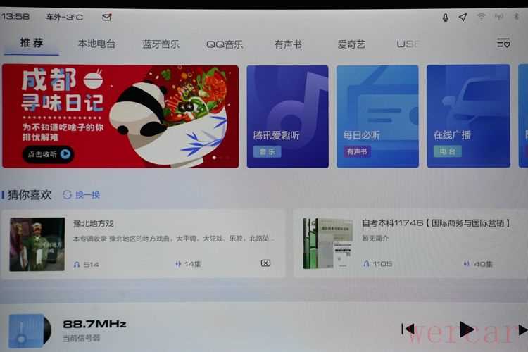 在多媒体界面,除了收音机(之所以把它写进来,是因为某些汽车品牌打算今后要取消收音机,此种强迫消费者的行为,令人愤怒),还有喜马拉雅之类的音频分享平台、蓝牙音乐、QQ音乐、爱奇艺,等等,内容很丰富。遗憾的是,许多功能都需扫码登录才可使用,因而未能体验。我认为,从方便消费者的角度出发,一些基础功能不应设此障碍。事实上,仅就最近1个月内试驾过的车辆而言,有好几辆车都做到了这一点。