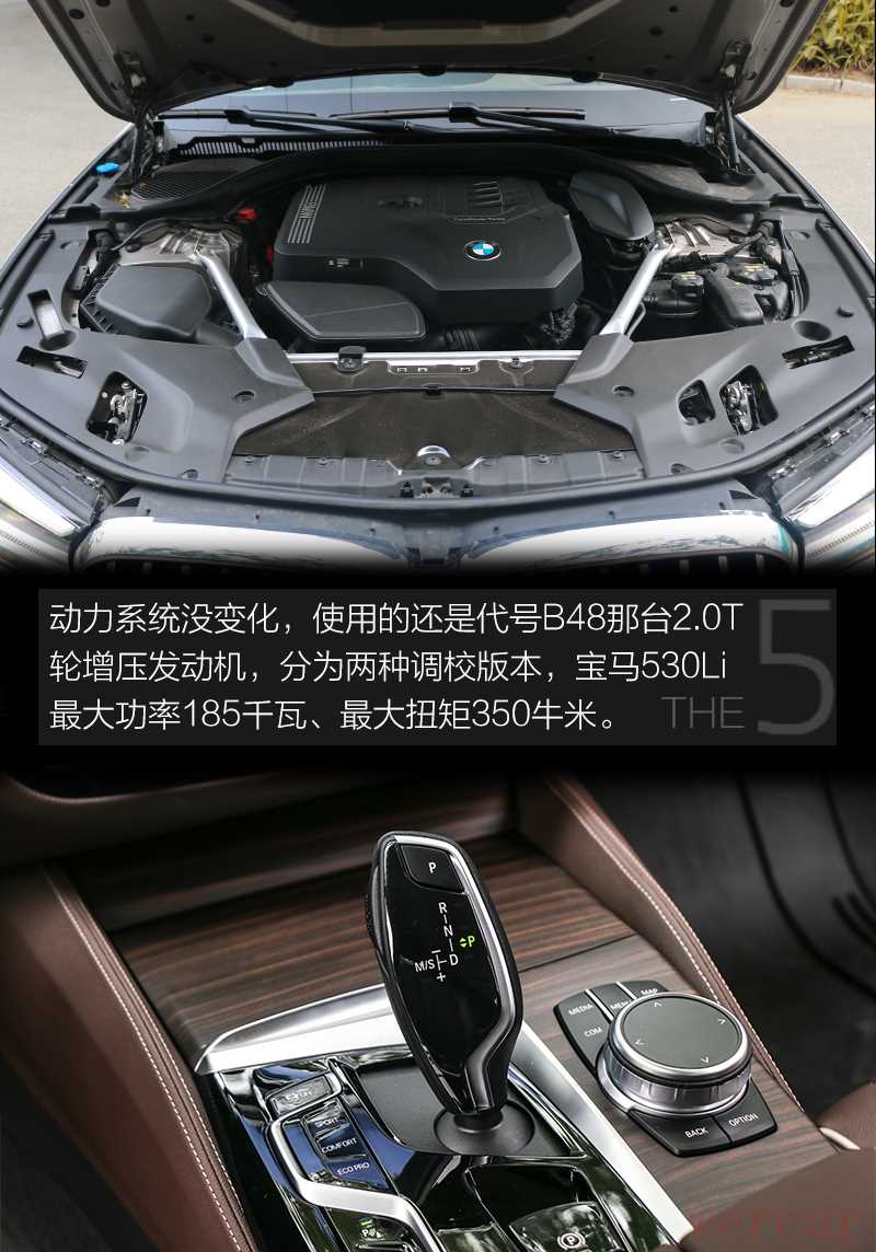 宝马5系全系标配2.0T+8AT变速箱,其中有两种动力输出可以选择,520Li的最大功率135千瓦、290牛米,而530Li最大功率185千瓦、最大扭矩350牛米,动力方面与老款保持一致。