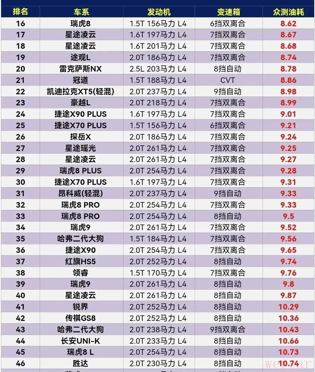 1. "数据来源和测试标准:" 任何油耗排行榜都需要明确其数据来源和测试标准。中国汽车工业协会(CAAM)会定期发布乘用车燃料消耗量评价规程,通常基于NEDC(新欧洲驾驶循环)或WLTC(世界轻型汽车油耗统一法规测试循环)标准。不同的测试标准得出的油耗数值会有显著差异。NEDC通常比WLTC更“友好”,给出的油耗数值更低。瑞虎8、探界者和锐界这类主流中型SUV,官方公布的WLTC油耗数据会更接近实际使用情况。你提到的排名很可能基于某个特定的测试标准或特定条件下的测试(比如满油满载爬坡等极端工况),或者是一个非官方的、基于用户反馈或特定场景的统计。