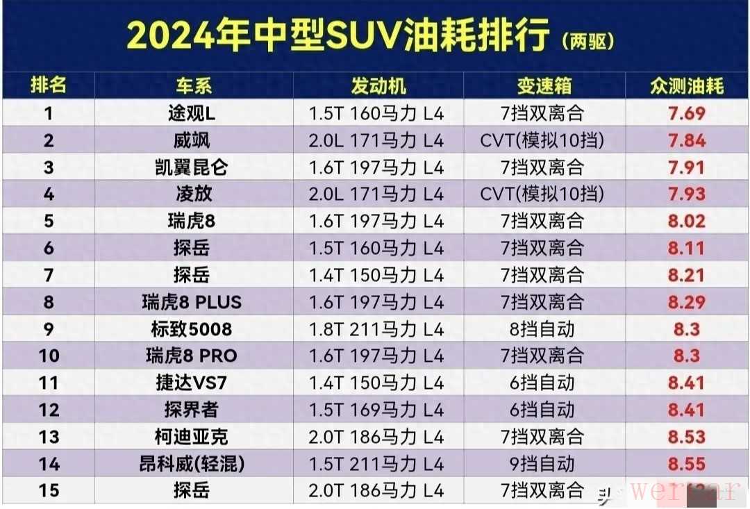 真强对决!中型SUV油耗榜单揭晓,瑞虎8领跑第五,探界者第12,锐界仅排41