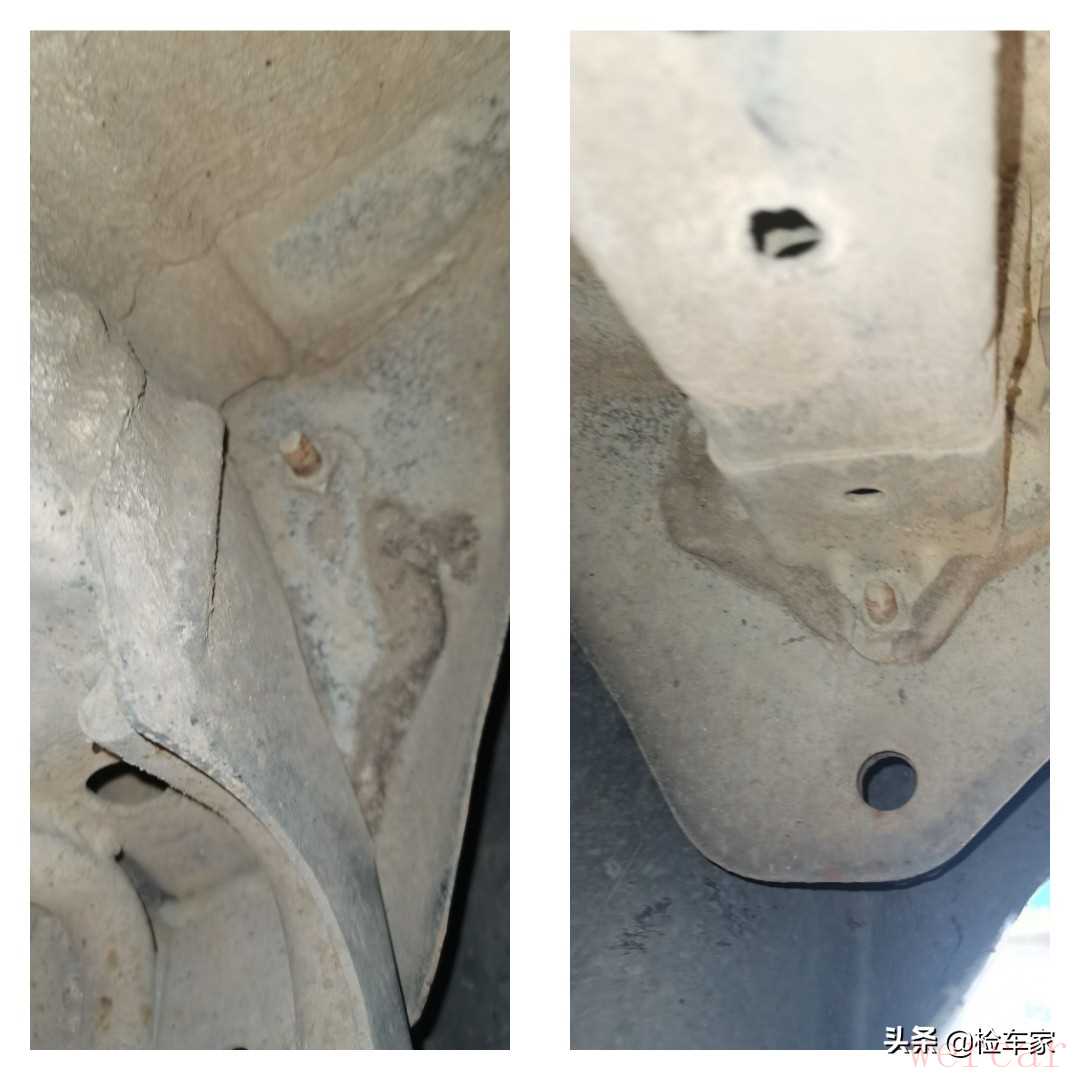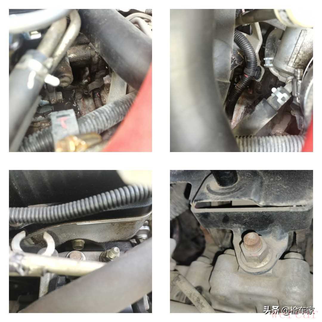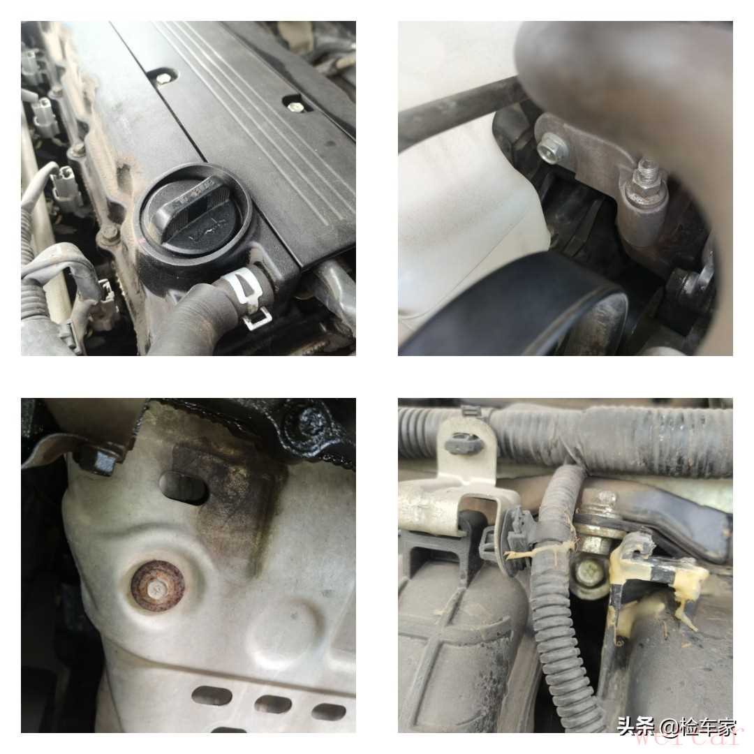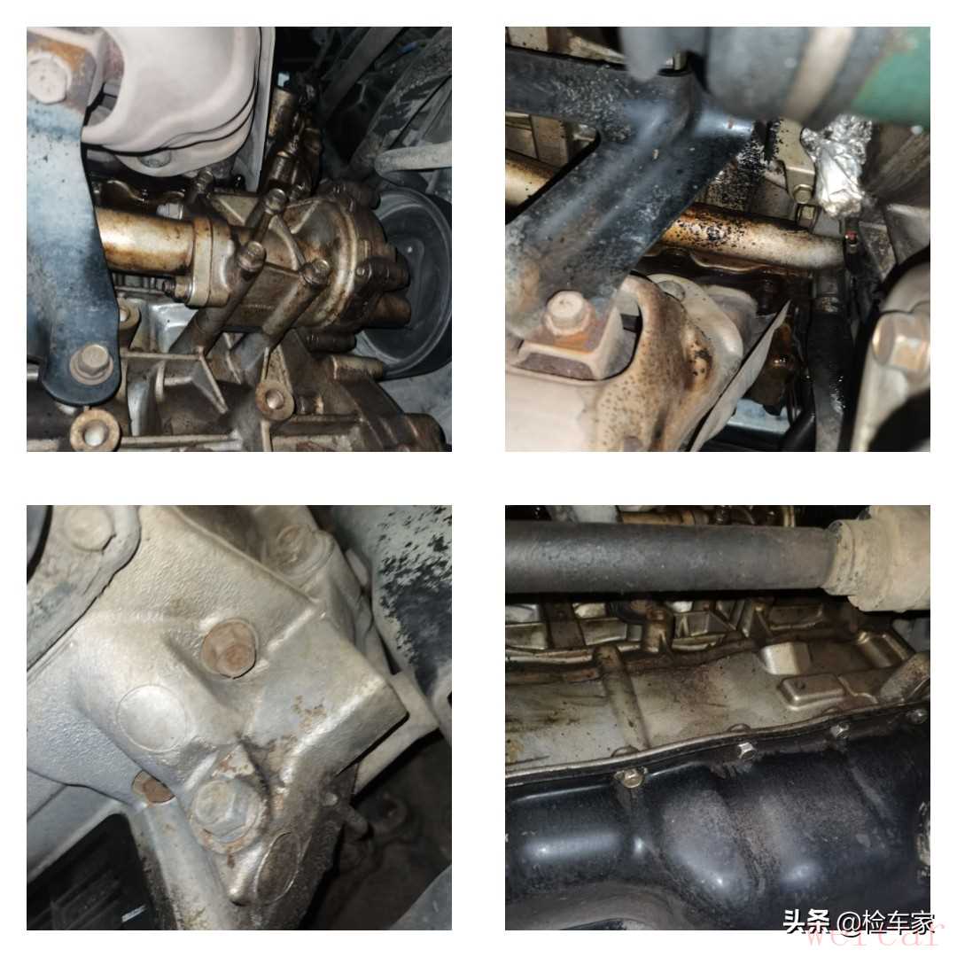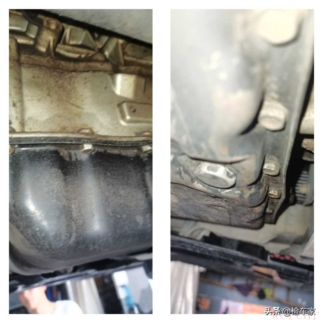 发动机油底壳和变速箱油底壳也是有过拆装,现在还在漏油。所以判断发动机和变速箱有过分离,而且发动机有过大修的痕迹。