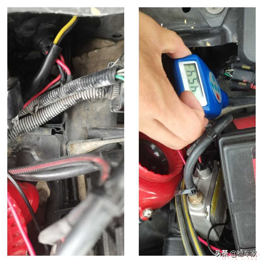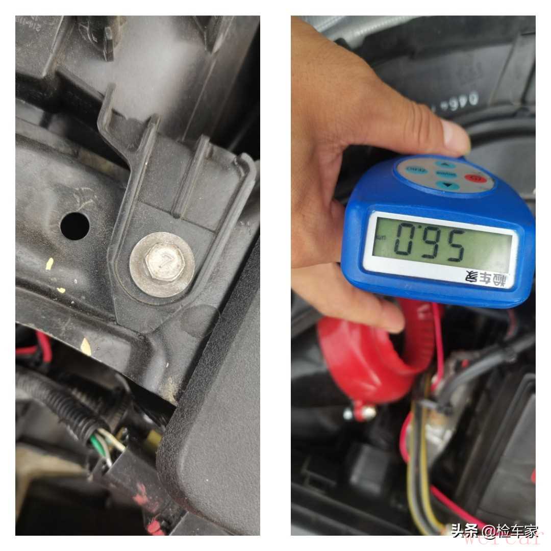 看完水箱框架和防撞梁有过拆装,我们就要重点检查两边的纵梁有没有受伤,通过仪器检测和肉眼判断可知前纵梁是没有问题的,说明车辆前部至少是没有发生过重大事故的。
