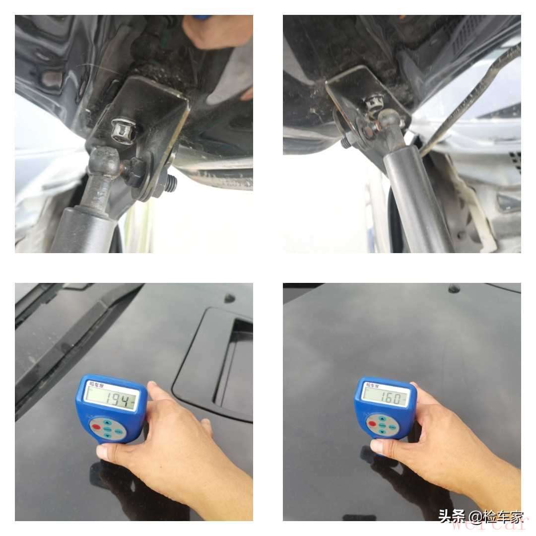 但前机盖的螺丝有明显的拆装痕迹,机盖的漆面数值明显低于车顶的漆面数值,所以说前机盖是有更换的情况,卖家当初表示这就是改的套件,当时还花了他两千块。小宝我就笑笑,这改装机盖最多也就700块吧。