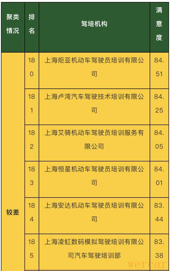 准备考驾照的小伙伴注意啦!市道运中心公布了本市2019年下半年驾驶员培训服务质量顾客满意度测评报告,测评内容涉及经营管理、规范教学、廉洁带教等。在参与测评的188家培训机构中,满意度为“优秀”的企业有18家,“较差”的企业9家。详见↓
