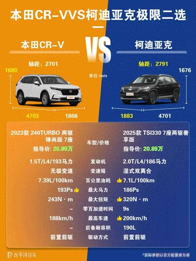20万左右的预算,想买一台7座SUV,在本田CR-V和柯迪亚克之间纠结好久了,到底该选谁?今天就来给大家对比分析一下这两款车