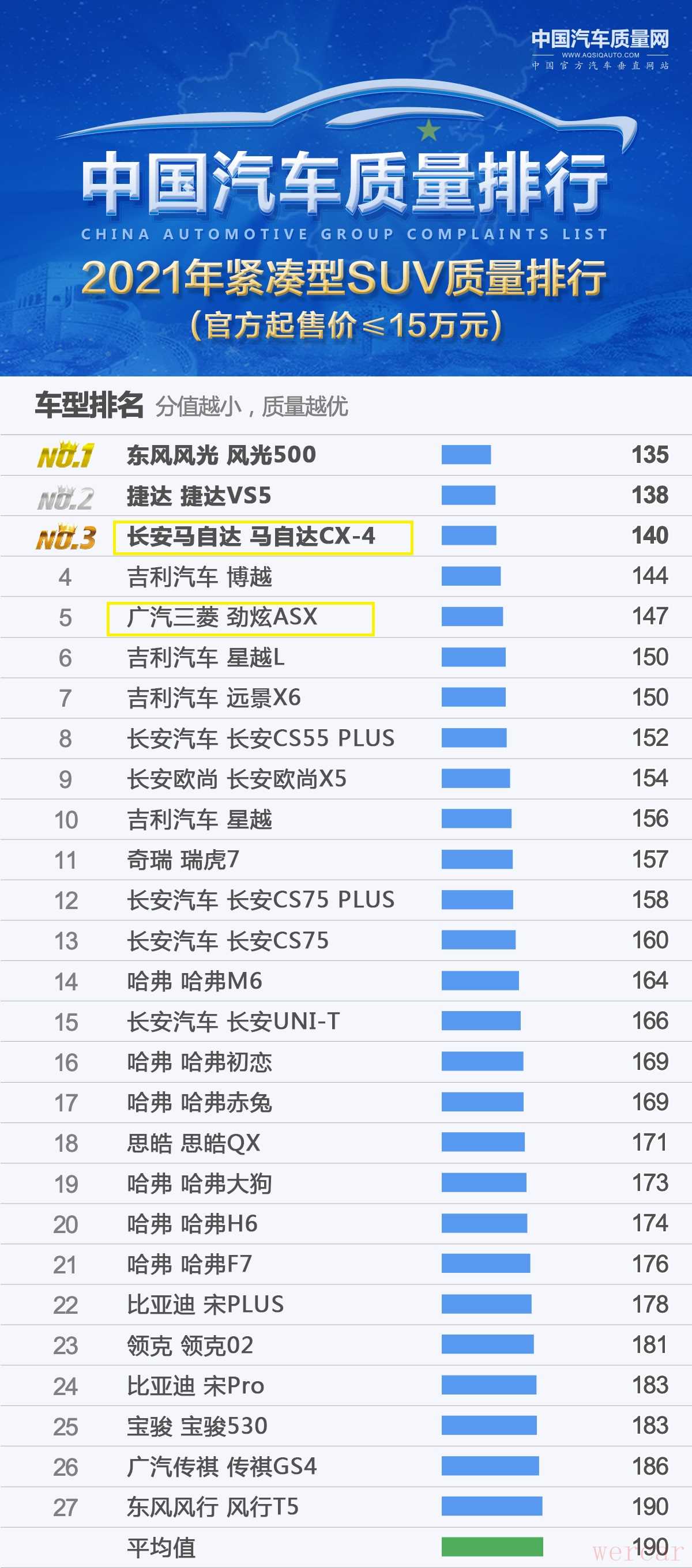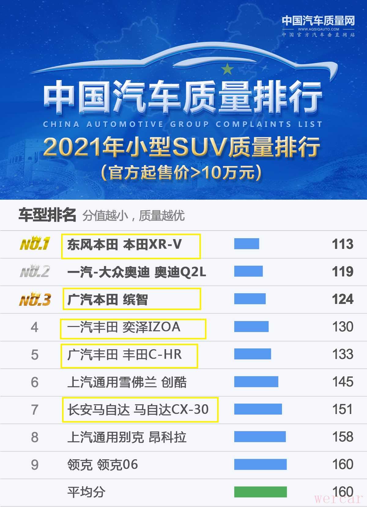 首先来看下日系小型SUV的质量表现,根据中国汽车质量网公布的榜单来看,共有5款日系SUV质量合格,本田XR-V夺得冠军,本田缤智也是位居前三,丰田奕泽IZOA和丰田C-HR也都是入榜前五,马自达CX-30的质量表现也处于平均值之上。本田XR-V和本田缤智都是年销15万以上的合资SUV,它们的品质表现确实很出色,而且经济性以及性价比都比较出色。