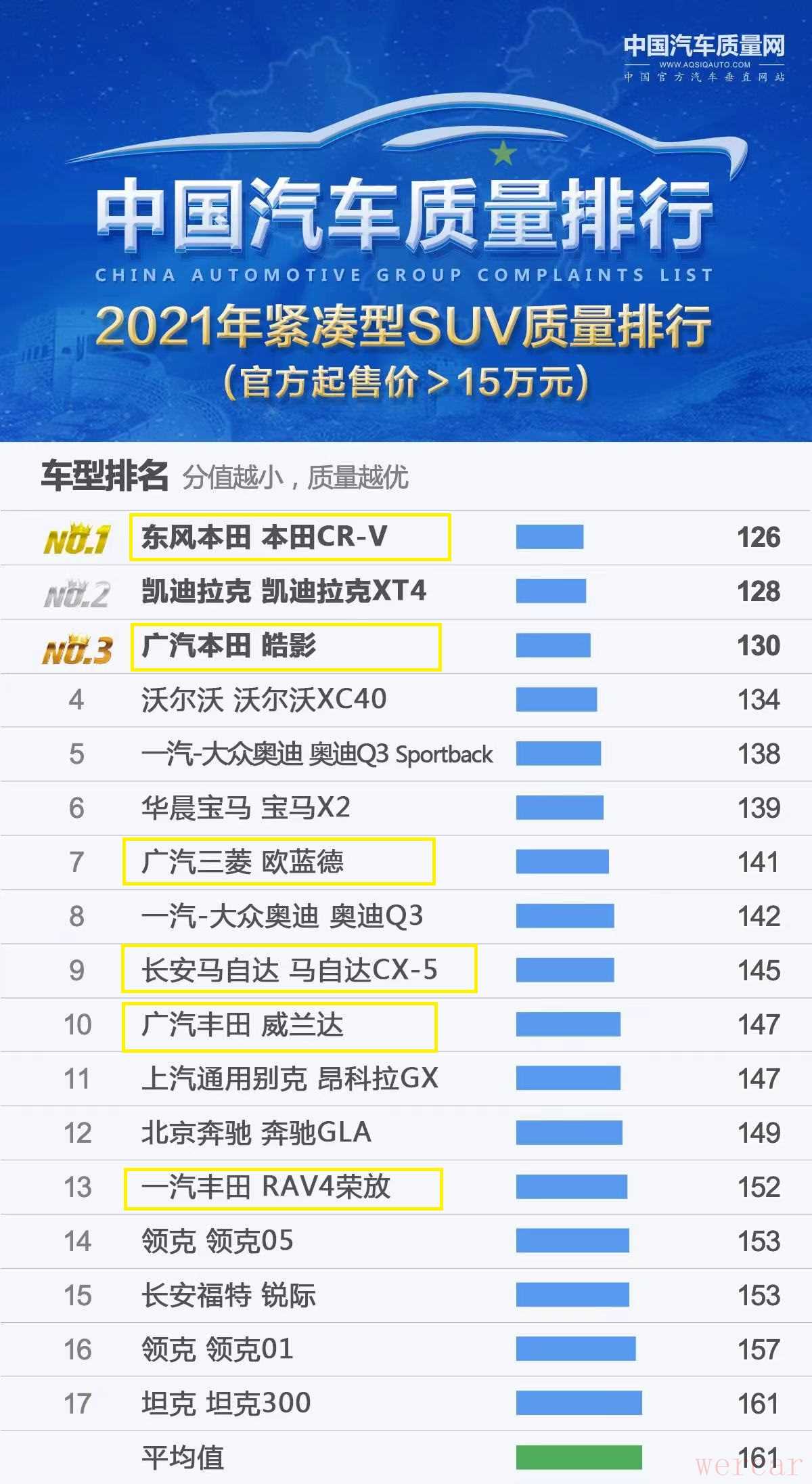 再来看下日系紧凑型SUV的质量表现,起售价低于15万的日系SUV共有2款,分别是排名第三的马自达CX-4以及排名第五的三菱劲炫ASX,它们的质量分都低于150(越低越可靠)。而起售价高于15万的日系SUV则有6款,销量王本田CR-V轻松夺冠,而它的姊妹车型本田皓影也是排名第三。另外,上榜的车型还有三菱欧蓝德、马自达CX-5、丰田威兰达和丰田RAV4荣放,丰田RAV4荣放排名靠后,还是比较令人意外的。