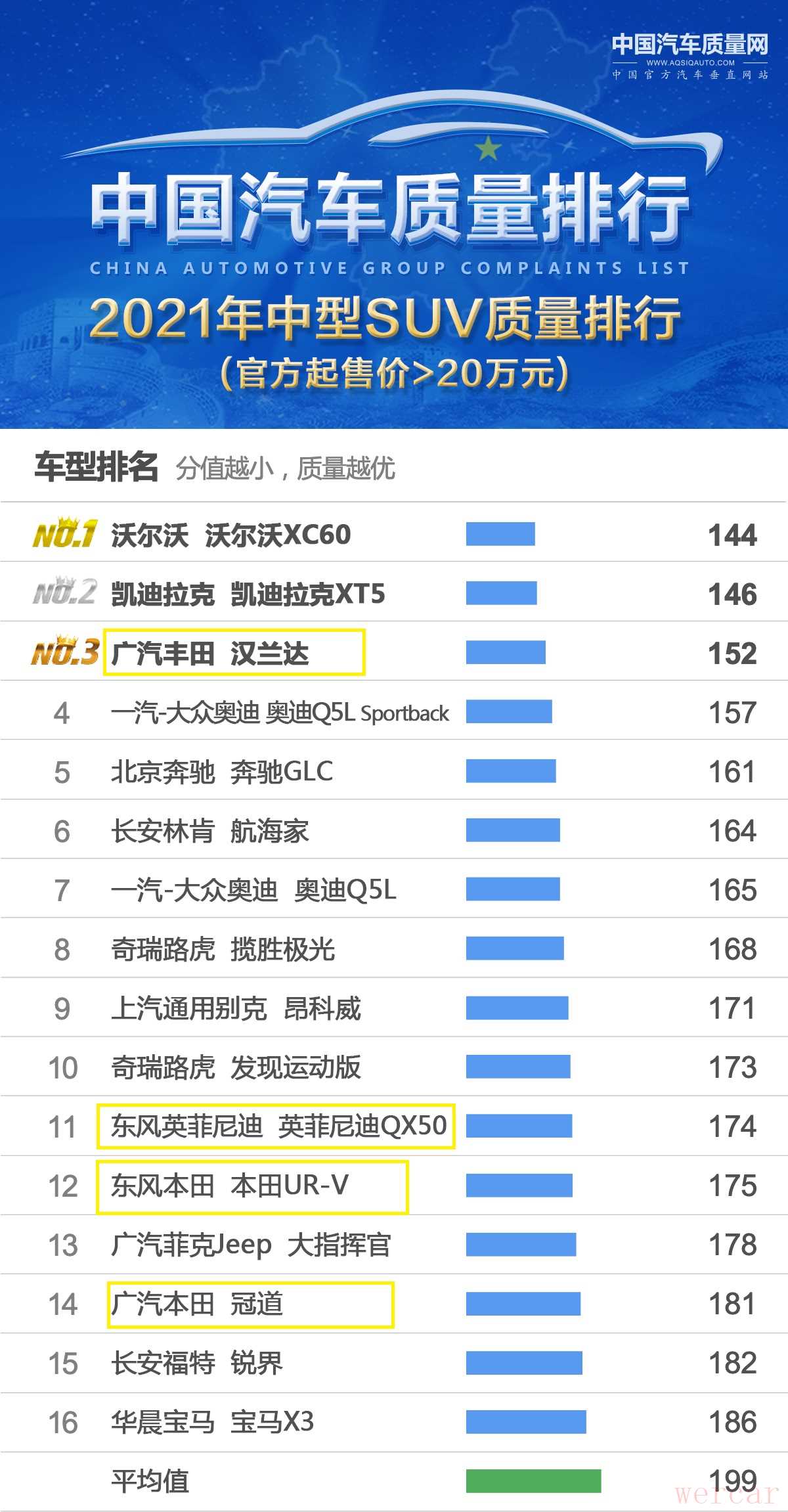 最后来看下日系中型SUV车型的表现,在起售价高于20万的质量榜单中,日系SUV共有4款车型入榜,分别是丰田汉兰达、英菲尼迪QX50、本田UR-V和本田冠道,丰田汉兰达还是那么的令人放心,其质量表现排名前三,丰田汉兰达月均销量在7千辆左右,市场表现稳定,保值率表现也比较出色。不过销量表现一般的英菲尼迪QX50、本田UR-V和本田冠道,都未能入榜前十,质量分都超过了170。
