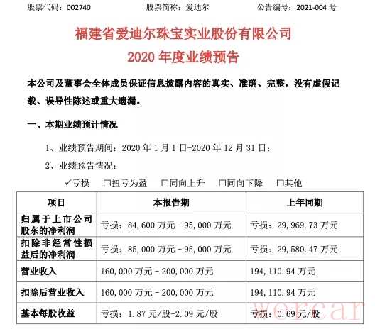 1月20日晚,爱迪尔发布业绩预告,预计2020年将亏损8.46亿元到9.5亿元,亏损额大幅高于2019年的亏损额3亿元。公司对子公司失去控制、重组标的无法完成业绩承诺。