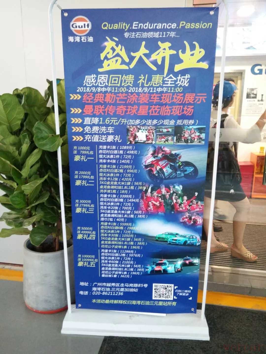 9月13日下午,在海湾石油三元里加油站的便利店门口,仍摆放着开业期间的优惠活动告示。