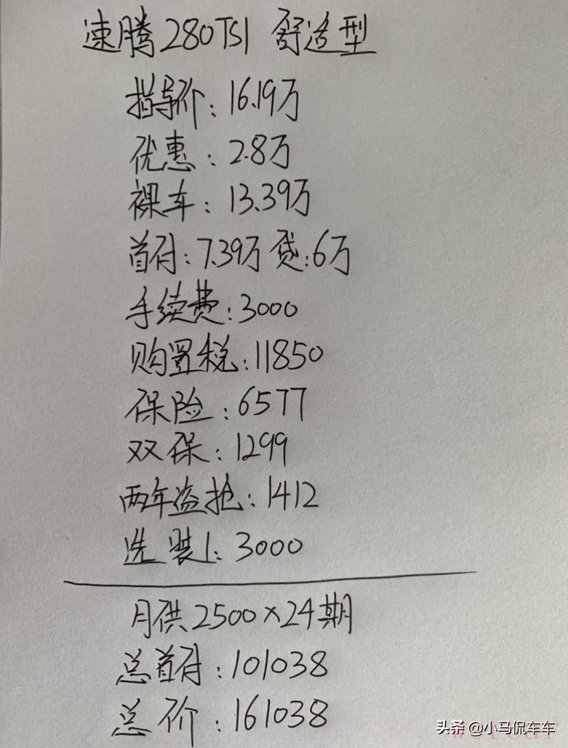 下面简单说一下我们山东济南地区,大众速腾1.4T舒适型的价格供您参考,此价格是2020年5月份正规4S店的报价。速腾1.4T舒适型官方指导价16.19万,贷款买的话,优惠力度在2.8万。全款买优惠力度在2.5万左右。贷款入手裸车价13.39万,首付7.39万贷款6万元,可以享受两年无息。贷款手续费3000块钱,购置税11,850元,保险费用6577元,强制购买双保1299元,包括4次保养。强制购买两年的盗抢险1412元。选装包3000块钱。