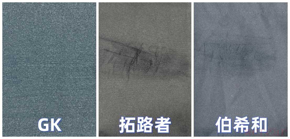 Gakior>伯希和>拓路者整体看下来,GK这件冲锋衣的耐磨性实测呈现突出,可稳定提供靠谱的防护力,不用担心会因为刮擦轻易的破损,长达十分钟的砂纸摩擦测试过程中,GK的表面涂层始终维持完整,没有刮痕,也没有起球,测评数据200000转,GK是相当“抗造”了,强力的耐磨性能源自于GK使用的STOPS-X七防科技面料。伯希和针对耐磨性的调校考虑得还是挺周到的,用防水压胶覆盖了多个高摩擦区域,像是袖口、肩部等处,实测中经历摩擦测试,表面没有太多划痕。拓路者高密度尼龙面料外壳呈现的耐磨性对比同价位产品没什么优势,经历摩擦测试出现了多处划痕。看本文之前,相信有很多人已经看到过超多人讨论Gakior、拓路者、伯希和冲锋衣怎么样?了解了它们在实测中的表现,相信大家也都能做出比较精准的判断了,拓路者防护力应对一些近郊出行,微风,中小雨当中基本是够用了,伯希和的耐磨性能达到了不错的水准,GK设计这款冲锋衣几乎是面面俱到,防护力MAX,适配极端环境穿着防护需求,透气表现卓越,还很耐穿。