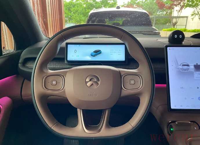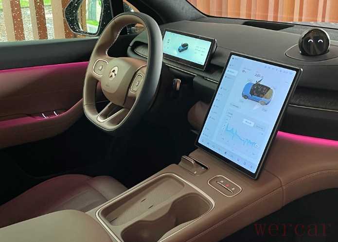 在蔚来的定义中,上层是科技层,有液晶仪表盘、悬浮式中控屏和NOMI,搭配隐藏式智能出风口和贯穿式的可再生藤木材质,勾画车身前室的视觉层次感。下层是舒适层,让座舱环境显得通透灵动,软触包覆材料与环抱空间线条型面刚柔并济。