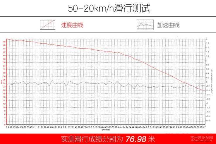 滑行测试环节,我们先将车辆提速到50km/h,然后将档位调至空挡,持续保持直线滑行,最后记录车辆速度从50km/h降到20km/h速度范围内滑行的距离。这个测试是最直观体现轮胎的滚阻大小,滑行距离越长,代表滚阻约小,也就越利于降低油耗。