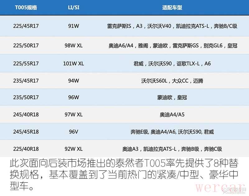 此次发布的T005其实我们并不陌生,早在2015年普利司通就已经和许多车企合作研发推出T005L相应的原配OE产品,我们能够在3系、A级、A6 All Road中就能见到它的身影。在T005的OE产品中,除了上面列出的偏向运动的T005L系列,还有T005A系列,而T005A系列在整个T005家族中更倾向于舒适性,例如雷克萨斯LS、LC500等原配胎都有所搭载。