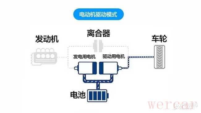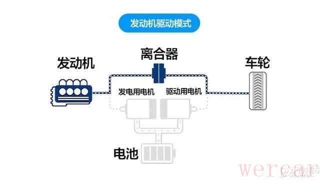 日产的e-POWER采用的是类似串联的模式,在任何工况下发动机只负责供电,不负责直接驱动车轮,由发动机提供电量给电机,电机负责提供驱动力,由于发动机不直接驱动车轮,所以运转状态一直处于较为高效的状态,油耗随之降低。