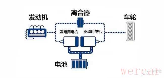 再说回串联结构的日产e-POWER,系统会变得非常简单,发动机不会直接驱动车辆,而是仅为电动机和电池供电,低速状态下还是利用电池内存电给电动机供电,而在需要较为大功率的状态下,发动机会介入发电通过逆变器供电给电动机,或者是给电池进行充电。这种模式可以理解为是一套增程式系统,但是不同于增程式,e-POWER不需要一块很大容量的电池,所以在安全性方面更加优秀,同时因为结构更简单,所以在后期维修保养方面的成本也更低。