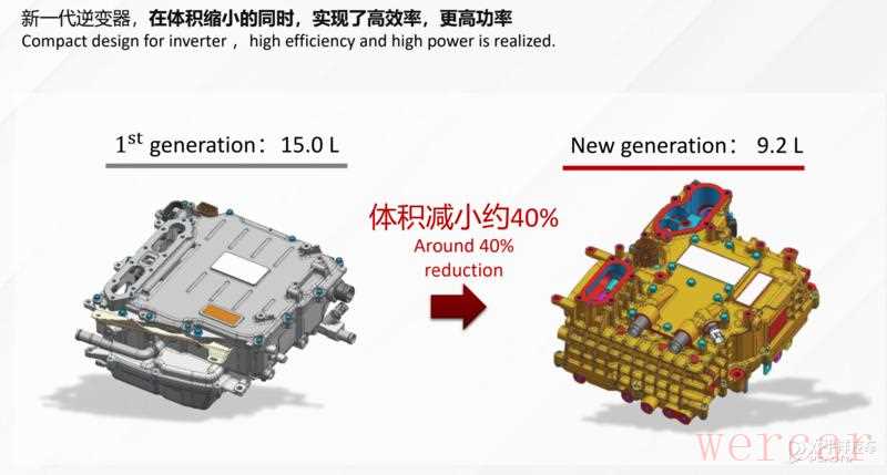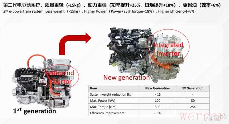 第二代e-POWER在第一代结构的基础上,将逆变器的体积缩小了40%,重量减轻了33%,电机的扭矩增加了10%以上,使用了集成式逆变器(更高性能的碳化硅和氮化镓半导体材料)和高效电机,内燃机热效率高达43%,发电机发电效率高达90%。